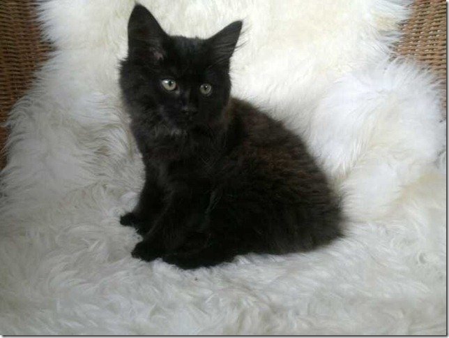 Liten, svart kattunge med halvlang pels.