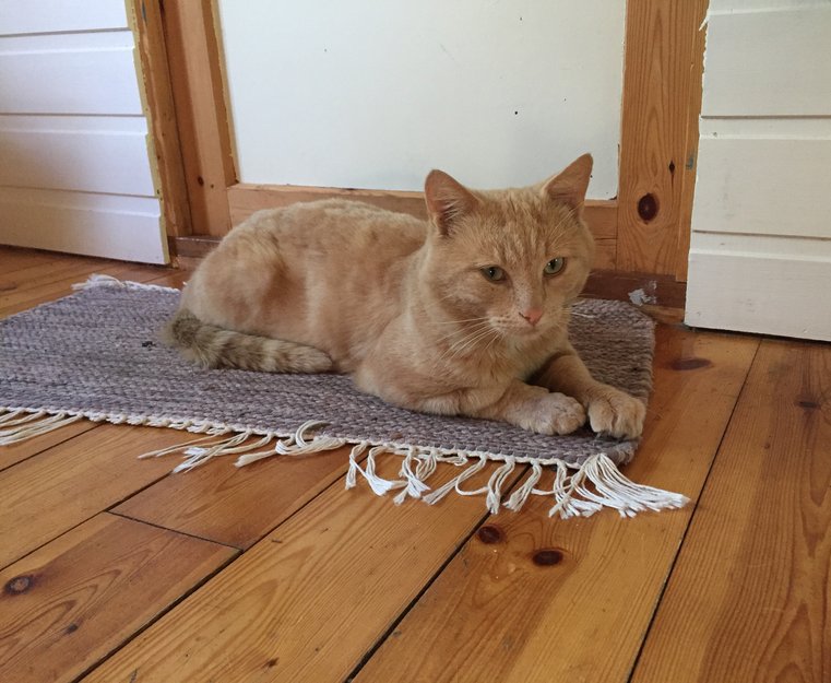 En lys oransje/creme farget hannkatt kom på døra, mjauet og holdt opp en betendt pote, klok gutt!