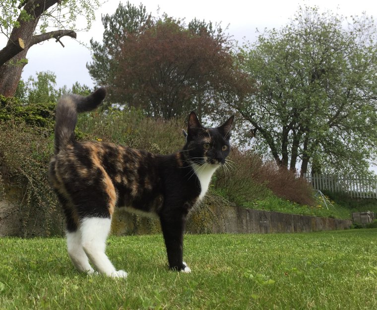 Hun har en orange stripe som går over det ene øyet.Hun er flerfarget hvit orange og brun.