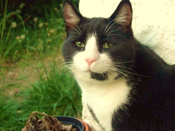 Svart med hvit på brystet, potene og litt i ansiktet. Veldig lang og stor katt men forholdsvis tynn.
