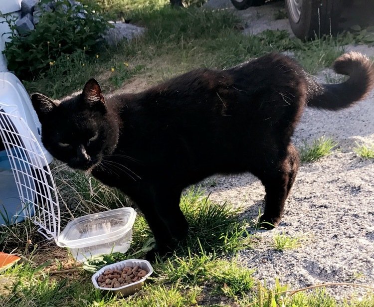 Sort som natten, veldig tynn. Hun er tydelig sulten for hun heiv seg over maten hun fikk, og tydelig tørst. Hun har nok familie et sted for hun er veldig kjærlig og kosete.