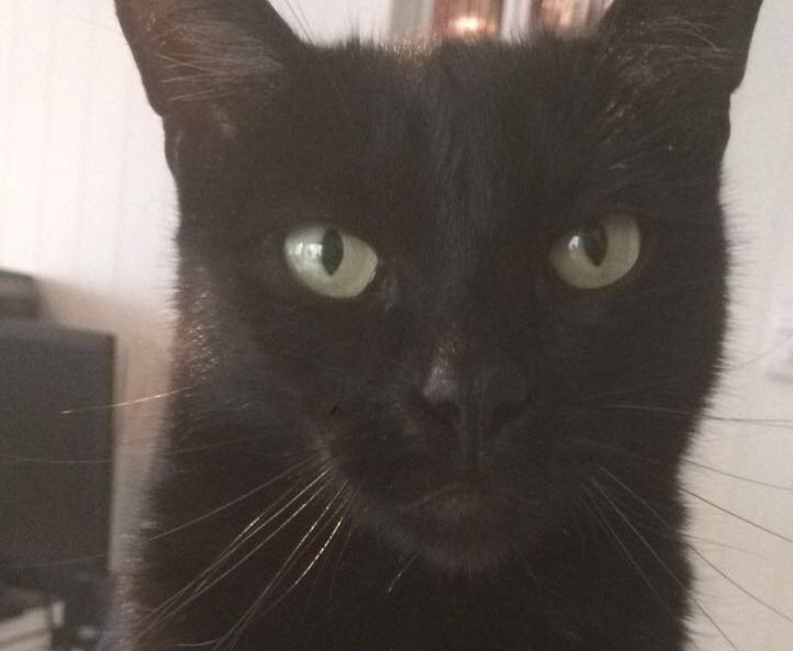 Vi savner katten vår, han har mellom langt svart pels med en hvit flekk under haken og en større hvit flekk på magen. Han er glad i menneske og liker kos.