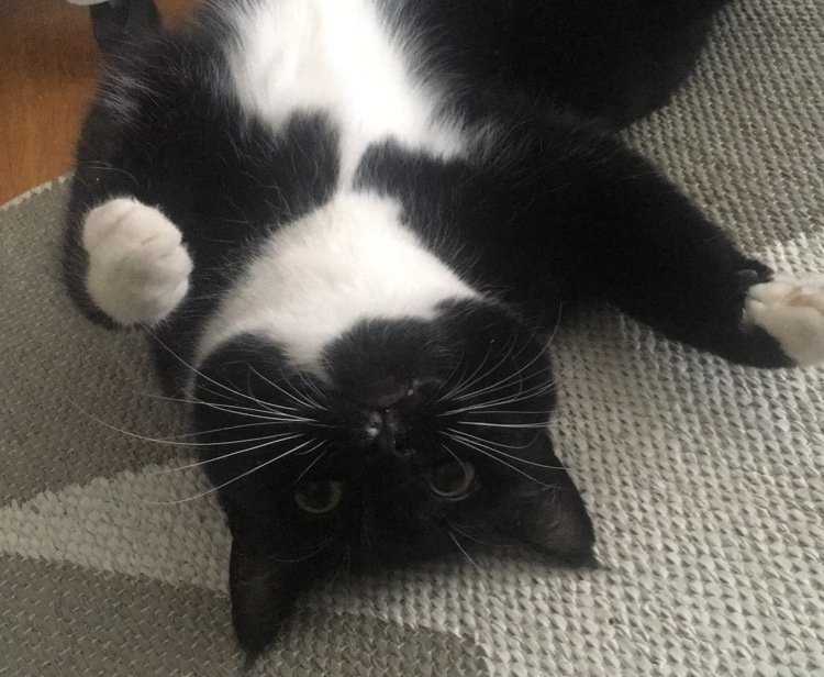 Liten svart og hvit katt på snart 3 år. Alt er svart utenom magen, halsen og potene hennes. Har ett lite hakk i det ene øret.