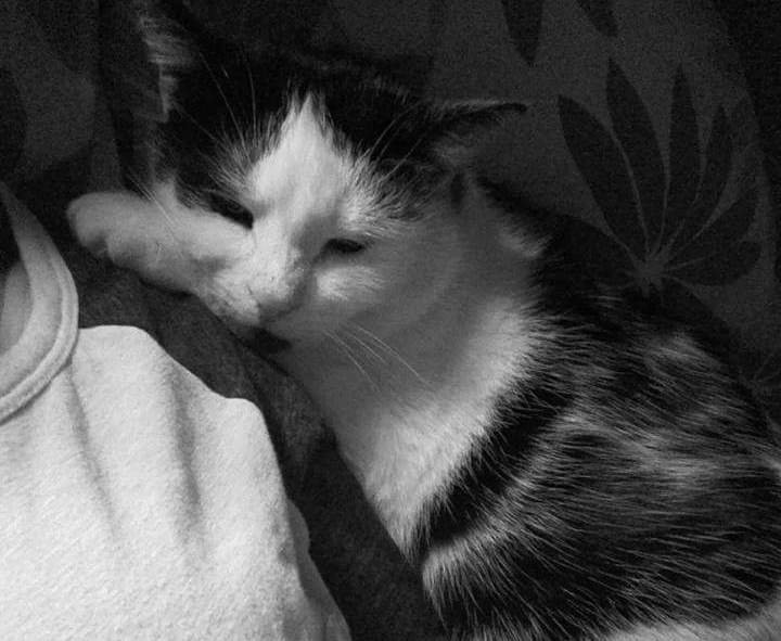 Mor er en gammel,sterilisert pus på 13 år. Hun er hvit i bunnfargen med sorte flekker. Hun har bla en sort flekk på haken så det ser ut som at hun har skjegg.