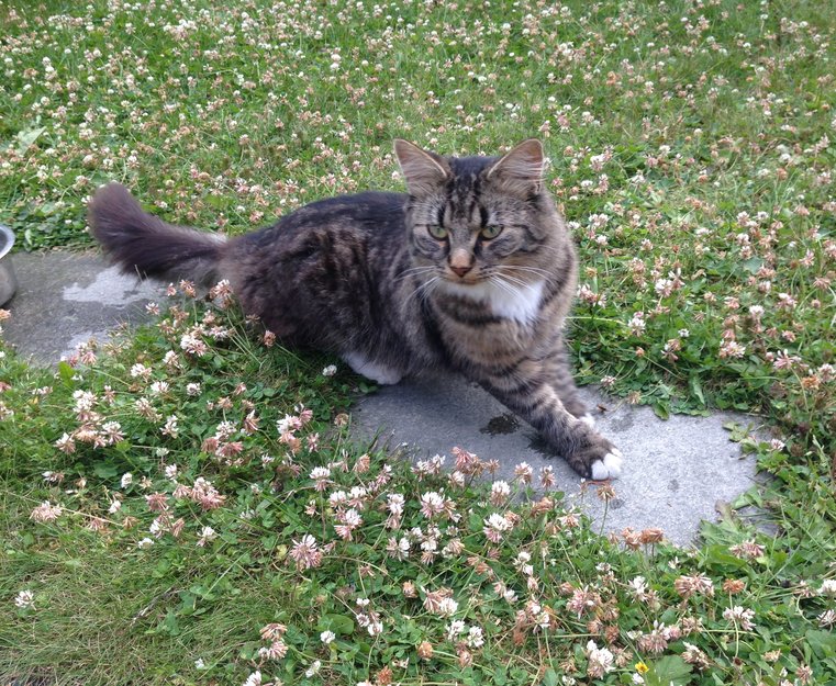 Katten dukket opp for noe tid tilbake. Er innom flere av naboene. Ekstremt kosete, tydeligvis vant til mennesker og vil gjerne inn, prøver hele tiden å komme inn i husene rundt her. Virker også som den er vant til hund for skremmes ikke av hunden min. Den mjauer mye. Jages av en annen katt i området og er litt mer sky enn den først var ift å sjekke om den andre katten dukker opp. - Er det noen som har flyttet/vært på ferie og latt katten være igjen/ den stakk av? Jeg håper eieren melder seg for det er en nydelig katt som trenger et hjem.