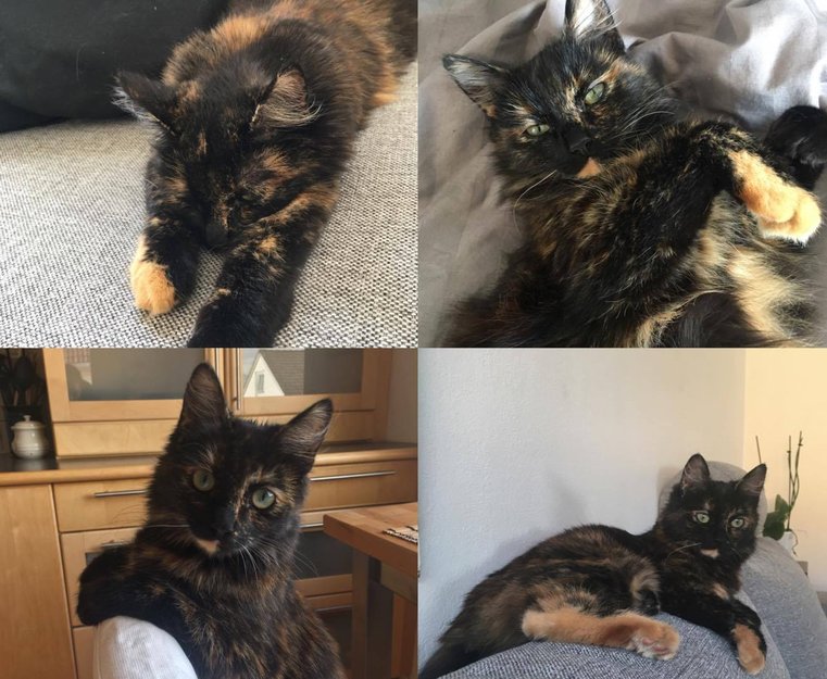 Hun har to poter som er hovedsaklig svart og to brune/orange. På magen har hun en hvit flekk. I fjeset er hun brun/orange rett under munnen på venstre side.