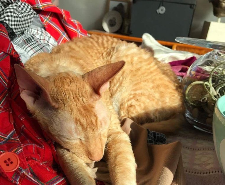 Han er en tynn katt med veldig kort, bølget pels. Han skiller seg ut fra andre katter. Store ører og spiss snute. Krøllede værhår.