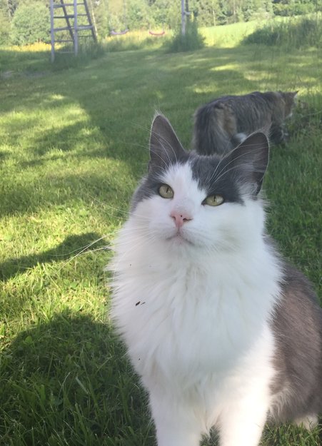 Spisst fjes( trekantet) , veldig lange labber, stor for alderen( 1år). Grå rygg og hale. Semilanghåret. Litt sky.