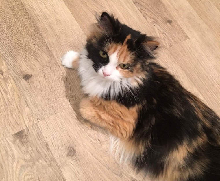 Tricolour, liten hunnkatt. Kastrert og chippet. Hun er ikke godt kjent i området da hun ikke har ønsket å gå ut. Hun er ganske redd av seg og vil nok virke sky for fremmede.