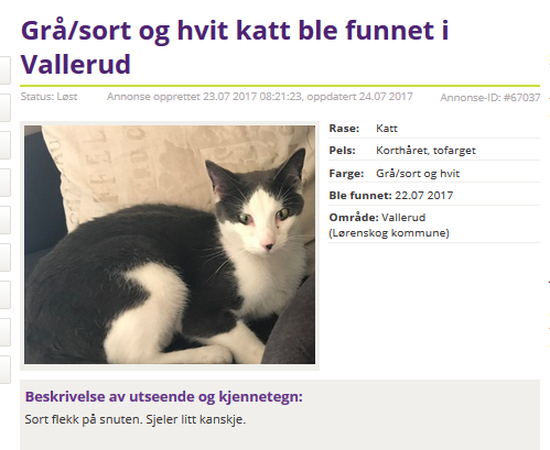 Denne katten har vært rundt huset vårt i snart en uke, og blitt reddet ned fra et tre etter et døgn. Den virker sulten og oppsøkende. Jeg ser det er laget en "funnet"-annonse på den tidligere som er merket oppklart, så om eierens identitet er kjent, er det fint om vedkommende kan få beskjed om at den befinner seg i Røyksoppstien.