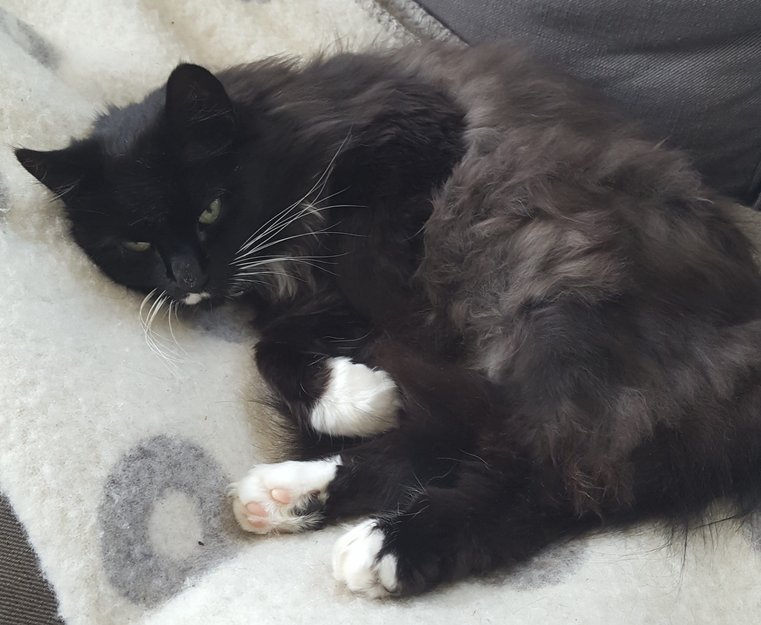 4 år gammel jentekatt med svart og hvit pels, noe brungrå på ryggen. Forsvant mandag 31 juli hjemmefra. Hun er vant til å være ute men har alltid holdt seg i nærheten, og kommet inn for natten. Hun har vært vært hjemløs tidligere og er skeptisk til nye mennesker. Hun lyder ikke navnet sitt, har tatovering i øret men den er vanskelig å se.