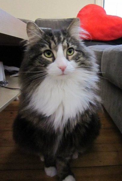 Snart 4 år og ganske stor hannkatt av rasen Norsk Skogkatt. Stor, bustete ekornhale. Bør være lett å kjenne igjen, da han er BARBERT for sommeren (løveklipp). Han har også et nokså nytt arr på bringen. Han har hvite sokker og hvit bringe. Ferie-passeren har fjernet halsbåndet, så han er ikke merket.