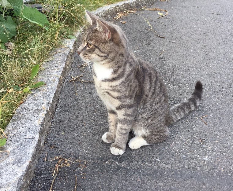 Meowth er 8 måneder. Veldig sosial og tillitsfull. Glad i kos. Han er gråstripete, men hvit på halsen og på potene.
