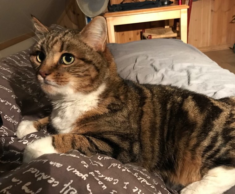Veslepus var borte i 9 dager. Vi gikk rundt i nabolaget og lette og ropte, og vi la ut info på facebookgruppen Katter og andre dyr savnet funnet Oslo og omegn. Der fikk vi et tips om å sette ut dokassen eller annet med lukten hennes, fordi de lukter det på lang avstand. Det gjorde vi, og to dager senere kom hun tilbake av seg selv. Hun er sliten, sulten, oppskrapet og engstelig men tydelig glad for å være hjemme igjen.