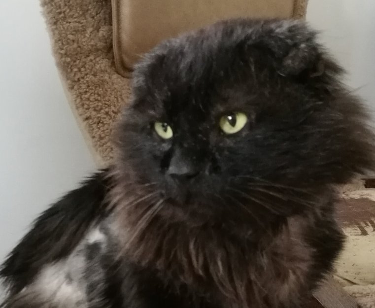Stor, men slank. Ørene ligger ned grunnet skade, det kan derfor se ut som han ikke har ører eller er sint. Delvis utvokst pels etter å ha fått klippet pelsen for en tid tilbake.