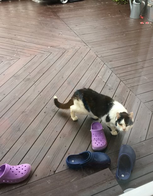 Den er forholdsvis stor men tynn. Hvit med store svarte flekker. Rødt øye (syk). Ikke veldig kontaktsøkende, men tydeligvis sulten.