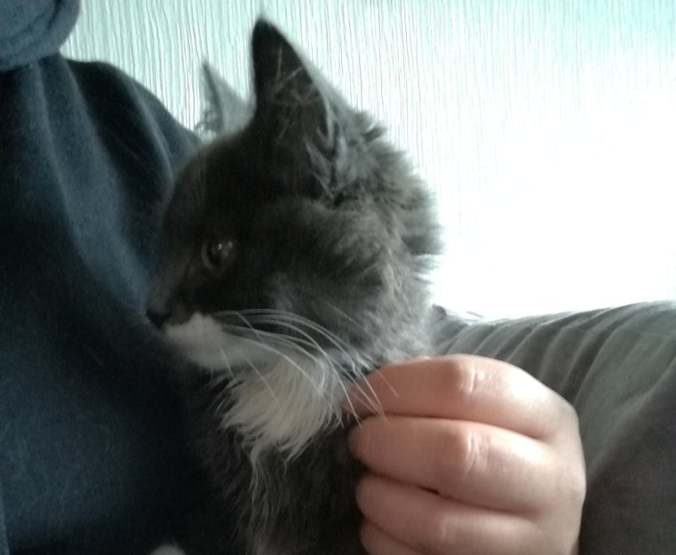 Det var flere folk rundt som ville hjelpe men hadde hund, så siden jeg har to katter fra før ble den med meg. Den er tam, vandt med folk, veldig kosete og tynn.