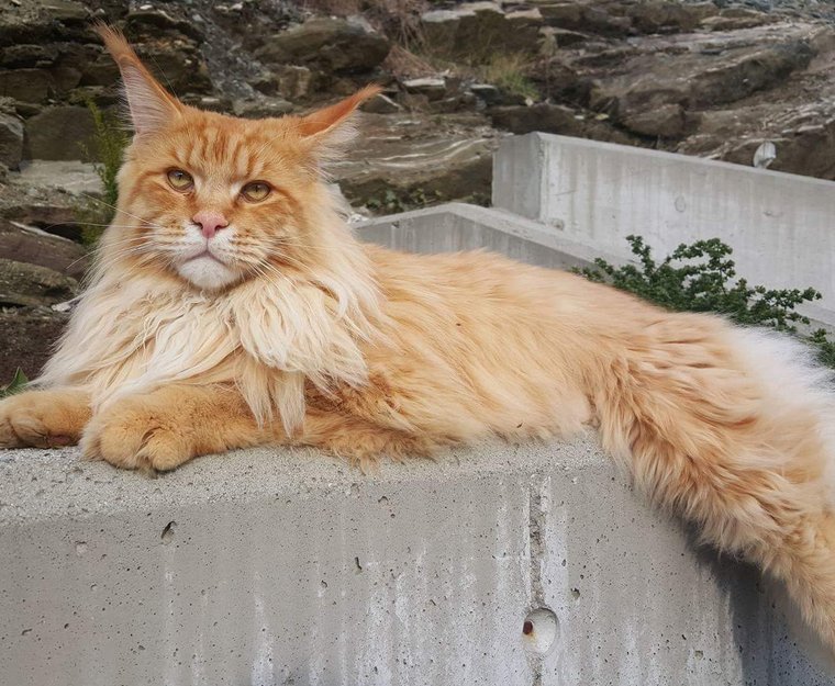 Katten er 10 kg,har ein lang hale og ein stor hårmanke i ansiktet.Er veldig sky for fremmede,men snill.