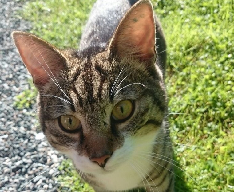 Han er tigerstripet og hvit på brystet, ikke så stor, 1,5 år gammel, veldig sosial og kosete. Han har chip og ID merke i venstre øre, kastrert er han også. Liker og utforske nye steder og majuer høyt hvis han er sulten.