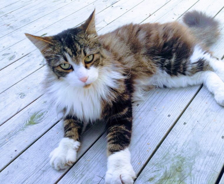 Veldig glad i kos, prater mye. Tillitsfull, trekker seg unna våre katter, ikke aggressiv.