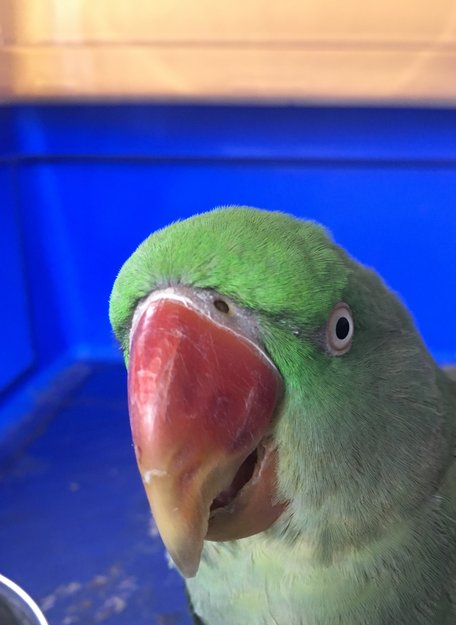 Papegøye fløy inn i vinduet. Er tatt vare på nå, virker til å være i fin form. Grønn med rødt nebb, muligens en dvergpapegøye.