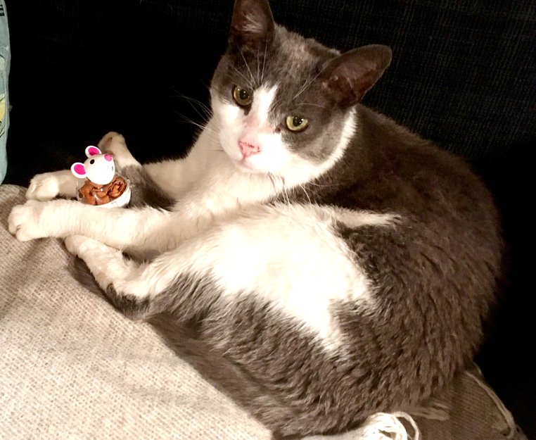 Grå og hvit hannkatt, veldig snill og sosial katt som gjerne vil besøke folk. Kan mjaue ganske mye. Har et lite hakk i et øre etter en slåsskamp. Rosa snute.