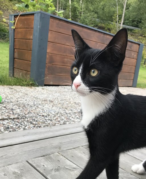 Kattunge eller ungkatt har vært på tomta vår siden i i går morges og det virker ikke som om den finner veien hjem. Den bor sikkert i nærheten men hvor? Hvis denne katten er ute alene for første gang må det vel være noen som leter etter den?