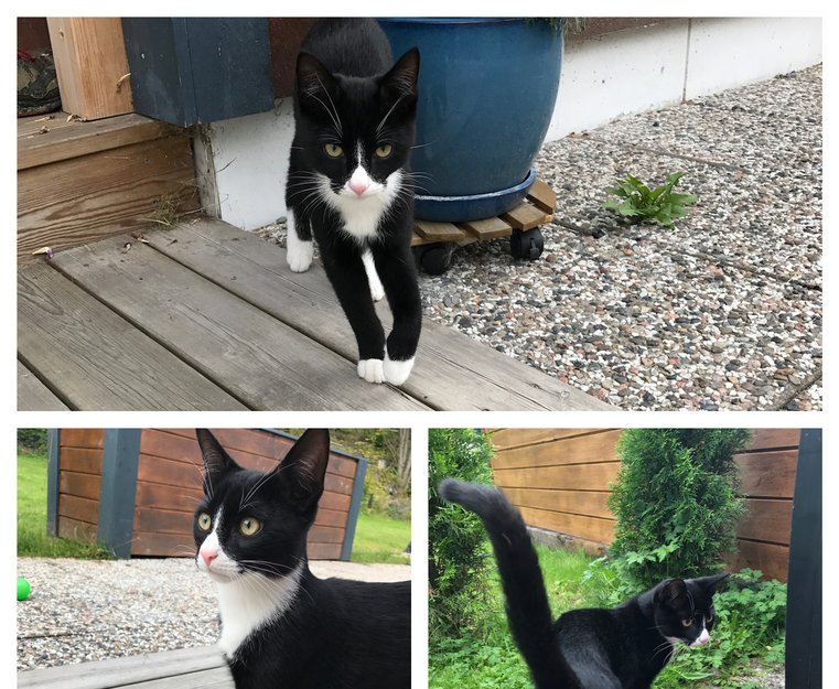 Kattunge eller ungkatt har vært på tomta vår siden i i går morges og det virker ikke som om den finner veien hjem. Den bor sikkert i nærheten men hvor? Hvis denne katten er ute alene for første gang må det vel være noen som leter etter den?