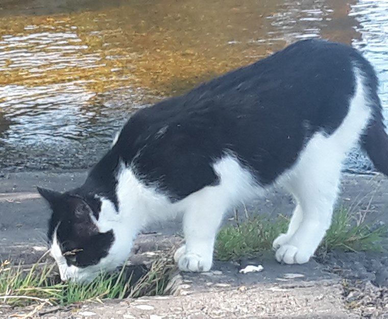 Sort/hvit. Liten gutt, kanskje under 1 år. Ganske avmagret. Ingen halsbånd eller merking i ører. Mater den noen dager før han blir tatt med til veterinær for å sjekke evt chipping.