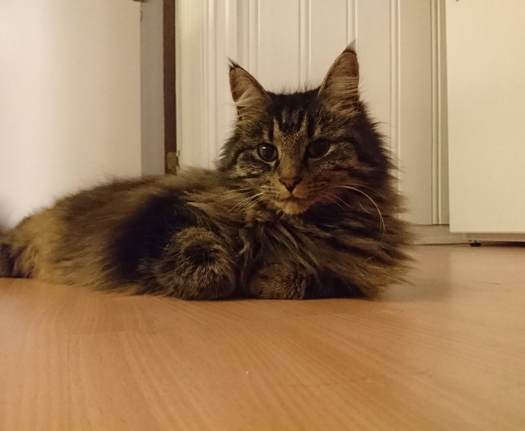 Langhåret, stort sett brun, men en anelse lysere noen steder i pelsen. Kan være enda litt lysere enn bildene om sommeren. Lite hakk i ene øret. Stor hale. Hun er ganske sky.