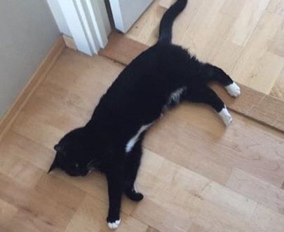 Katten har tre hvite poter og er hvit på brystet og magen. Ellers er hun helt svart.