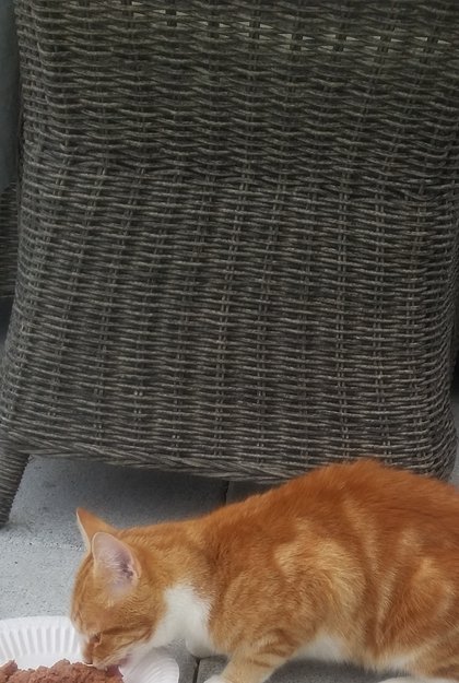 Katten oppsøkte oss søndag ettermiddag, til hytta. Kommer igjen hver kveld og overnatter under hytten. Er svært sulten og vi har nå gitt den mat.