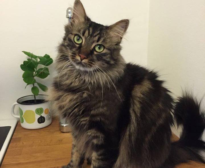 Bajaz hoppet ned 4 etasjer i terrasseblokken han bor i. Han er innekatt og veldig redd for alt som er ute i verden. Matskålen hans med litt tørrmat ble satt inne i buskene der han sist ble observert. Etter 3 dager hørte jeg mjauing ved matskålen. Bajaz virket klar for å hilse på meg, men det ble litt kamp når han skulle bæres hjem. Nå er vi lykkelige på sofaen og Bajaz er ekstra kosen :-)