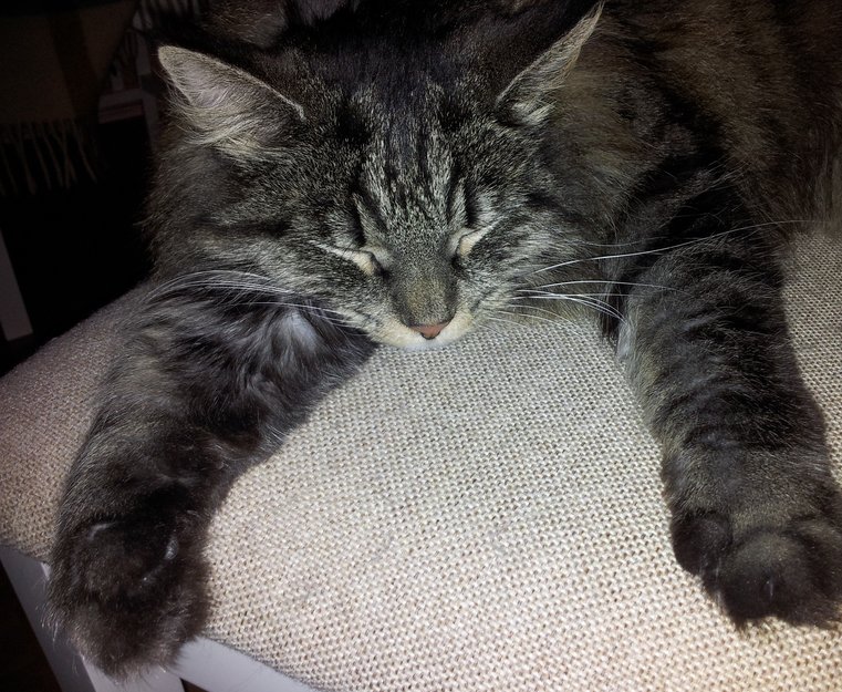 Liten katt, med lang grå spraglete pels. Veldig kosete og snill. Liker å "snakke"