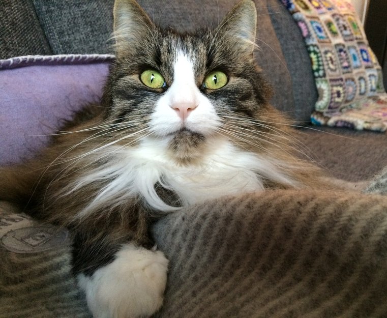 Ligner på en skogskatt, langhåret, stor,hvite poter/ nikkers. Hvit på nese/ hals.
