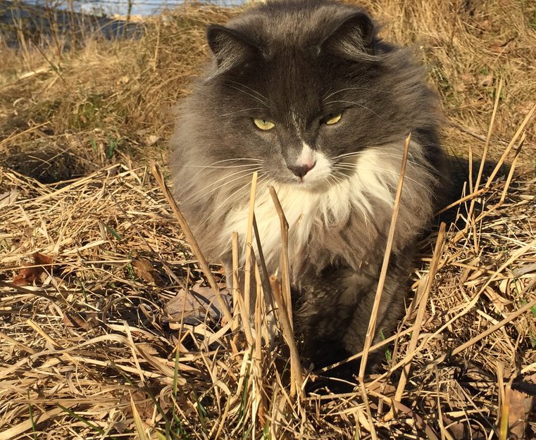Akkurat hadde baby klipt seg i sommer pga varmen så han er litt kortere enn på bildet. Han er vanlig katt størrelse og har chip.