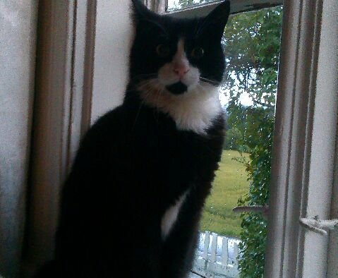Svart/hvit hannkatt. Hvit maske i ansiktet med svart flekk under haken. Hvite "sokker" på potene, samt hvit flekk på brystet. Var i dårlig forfatning da han forsvant.