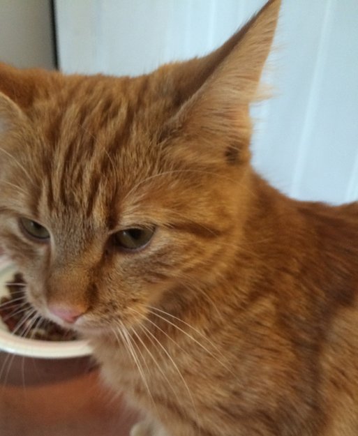 Oransje med litt hvitt under haka og ytterst på haletippen. Veldig sosial og glad i mennesker.
