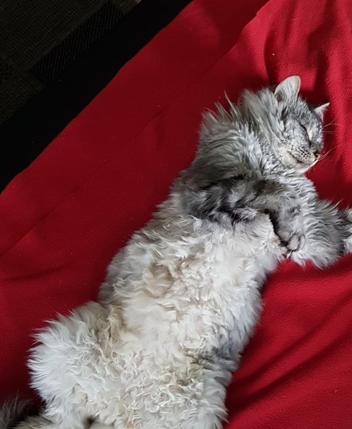 Bucky er ganske stor, veldig kosete og glad i både menneske og mat. Han har sikkert litt mer pels nå enn det vises på bildet pga han hadde blitt klippet før han kom til oss. Vet godt navnet, både Bucky og Lucky.