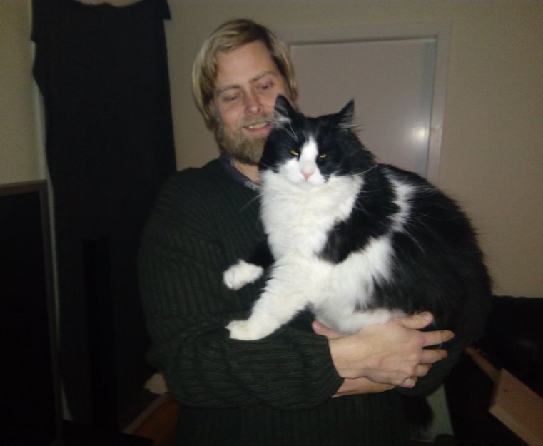 Ca 11kg tung hankatt, Langhåret sort og hvit.