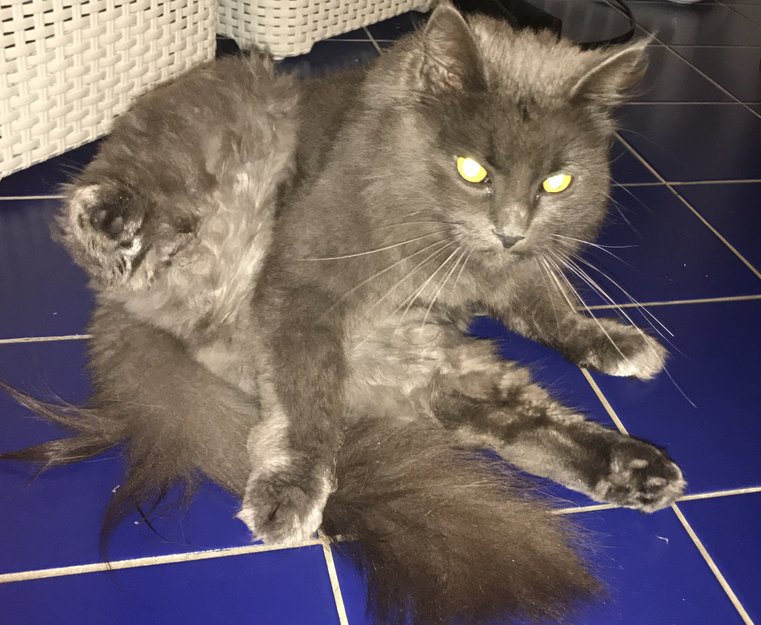 Han er en meget lodden katt, vanligvis er han ekstremt langhåret, ser nesten ut som en grå sau. Men hver sommer barberer jeg han, så for øyeblikket et den kort slik som på bildet. Han har gule øyne, føttene, hodet og halen kan virke et hakk mørkere enn kroppen, i tillegg har han et bakparti som kan virke lysere.