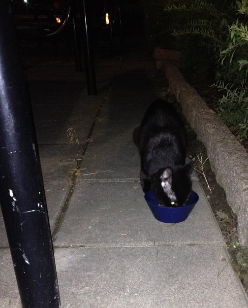 Katt funnet i bakgård. Liten/ ung katt. Den er helt svart med enkelte hvite hår på bryst og flanker. Først redd, så kjælen. Mager, svært sulten, skader i forlabbene. Gitt mat og levert hos veterinær.
