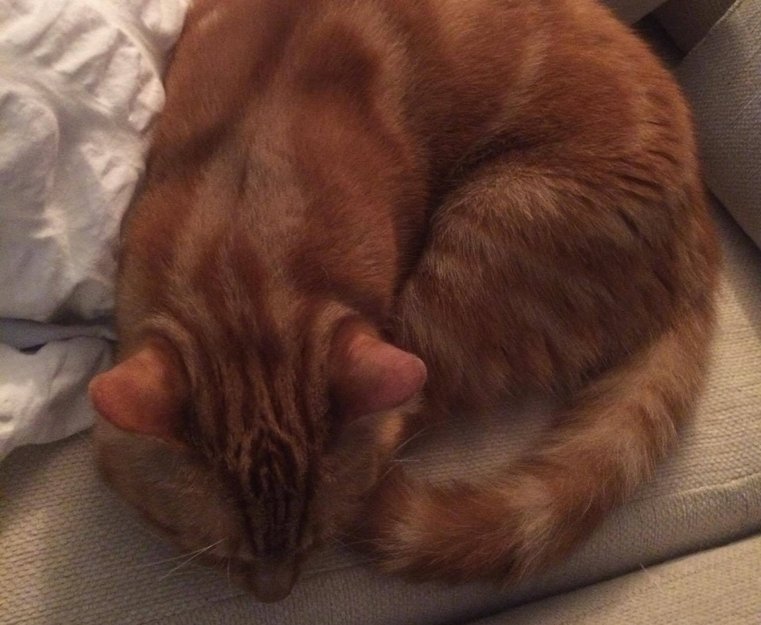 Dette er en innekatt som pleier å gå på verandaen, men i dag har den enten kommet ned fra verandaen eller kommet seg ut i gangen og ut, leita overalt inne i flere timer, i gangen og utenfor begge inngangene her. Dette er en dverg katt som er orange og litt hvit, tynn, spessiell hale som ligger bakover opp ved ryggen. Han er litt over 1 år.