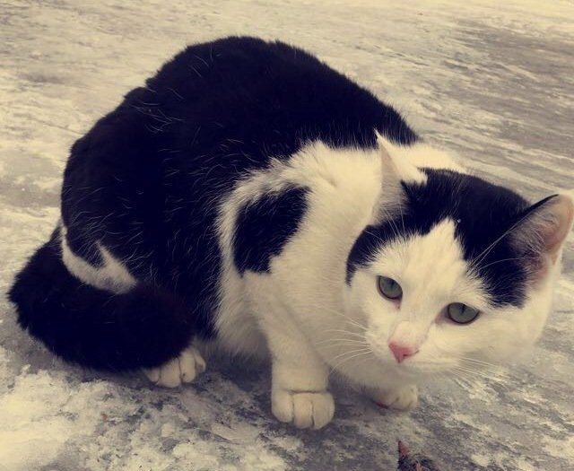 1 1/2 år gammel hannkatt. Kontaktsøkende og kosete pus. Svart hatt på hode, svart hale, hvit under magen og på potene.