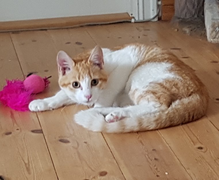 Vi har funnet en liten oransj/hvit kattunge, som vi har reddet inn fra regnet. Han savner hjemme sitt, men ingen har tatt kontakt på funnet plakatene eller meldt han savnet.