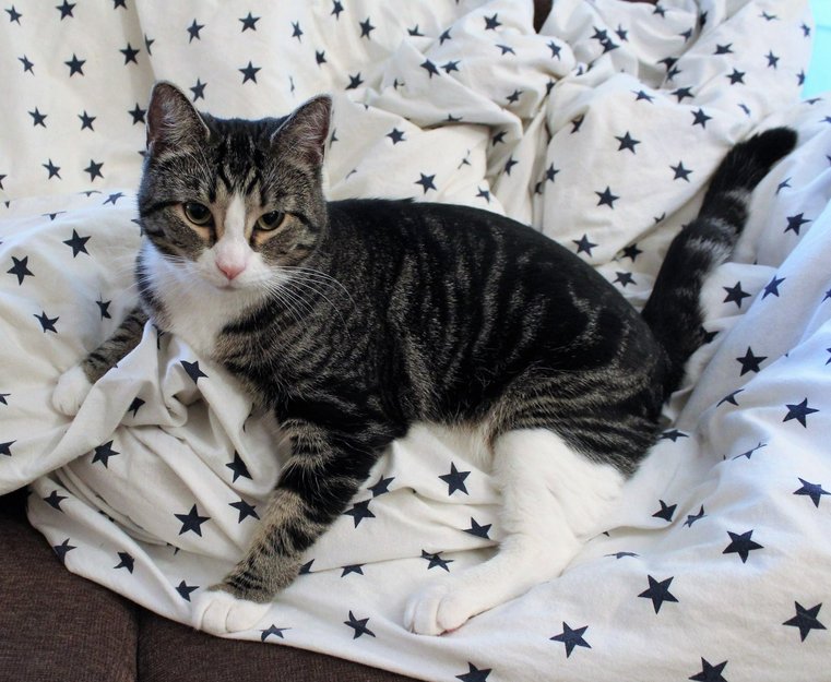 Grå tigerstripet med hvite tegninger i ansikt, bryst og poter.