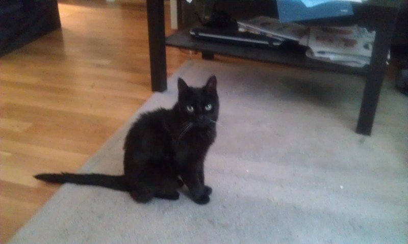 Liten pus, kan være så ung som 6 måneder. Mjauer en del, er kosete og tillitsfull. Liker å bli klappet på ryggen/magen. Markante gulgrønne øyne. Tre hvite værhår på den ene siden, ett på den andre. Tre hvite hår på brystet - ellers helt sort.