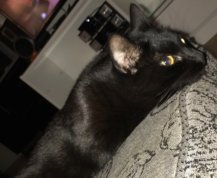 Sort, med gul/grønne øyner. Har på seg et rosa halsbånd
