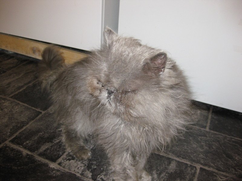 Katten er helt grå og med mye tover i pelsen. En ekte perser. Ganske tynn