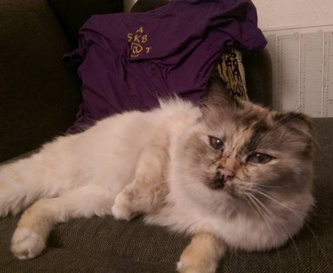 lys/beige halvlang myk pels, å har "fregner". gråblå øyer. mangler halve venstre øre. 14 år gammel hellig birma.